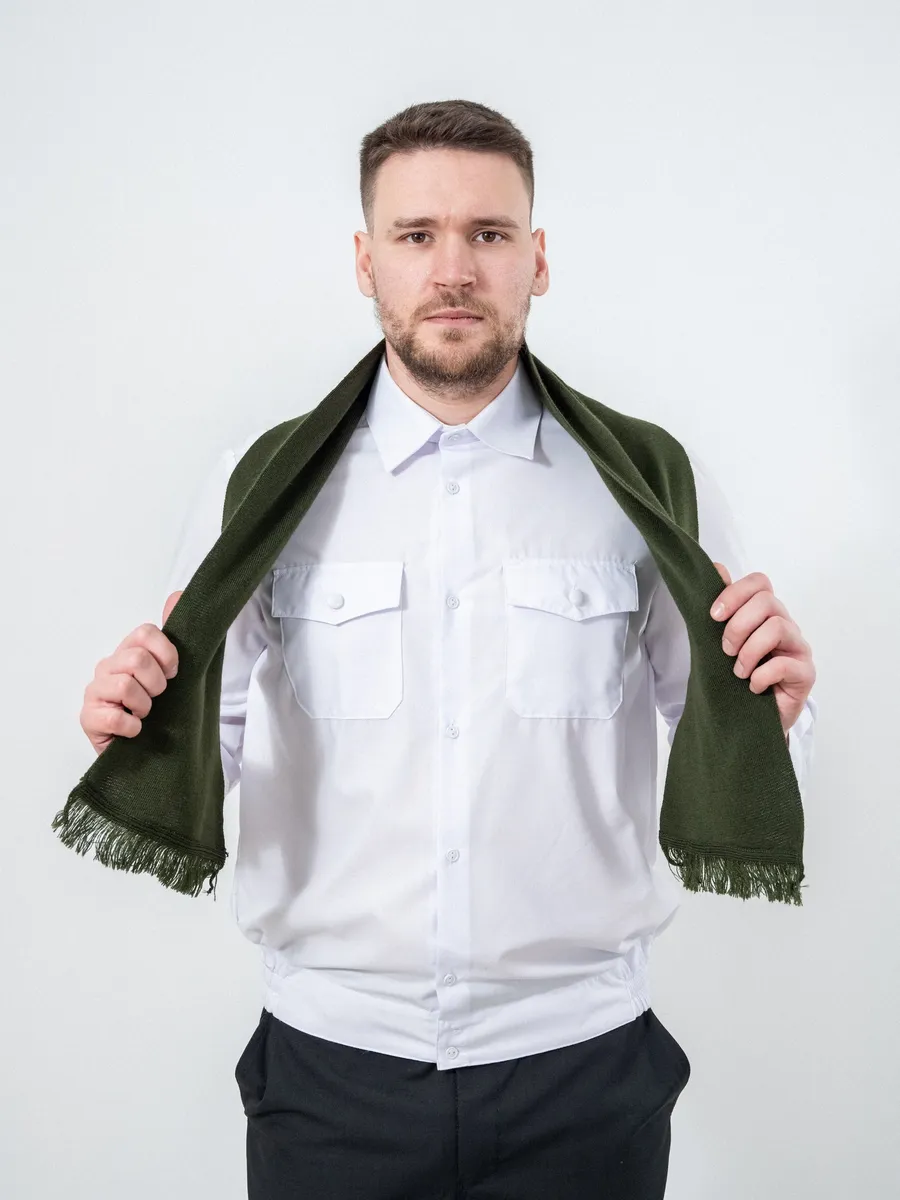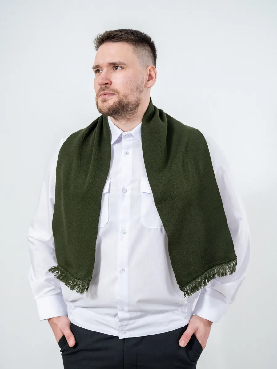 Шарф кашне мужской и женский для военнослужащих Армейский Уставной Армия России. Кашне используют при ношении форменного обмундирования, в холодное время года. Гладкий шарф с короткой бахромой по краям и эластичной вязкой.120*20 размеры шарфа. Платки форменные для Полиции МВД, ВМФ, МЧС, СВЧ.
