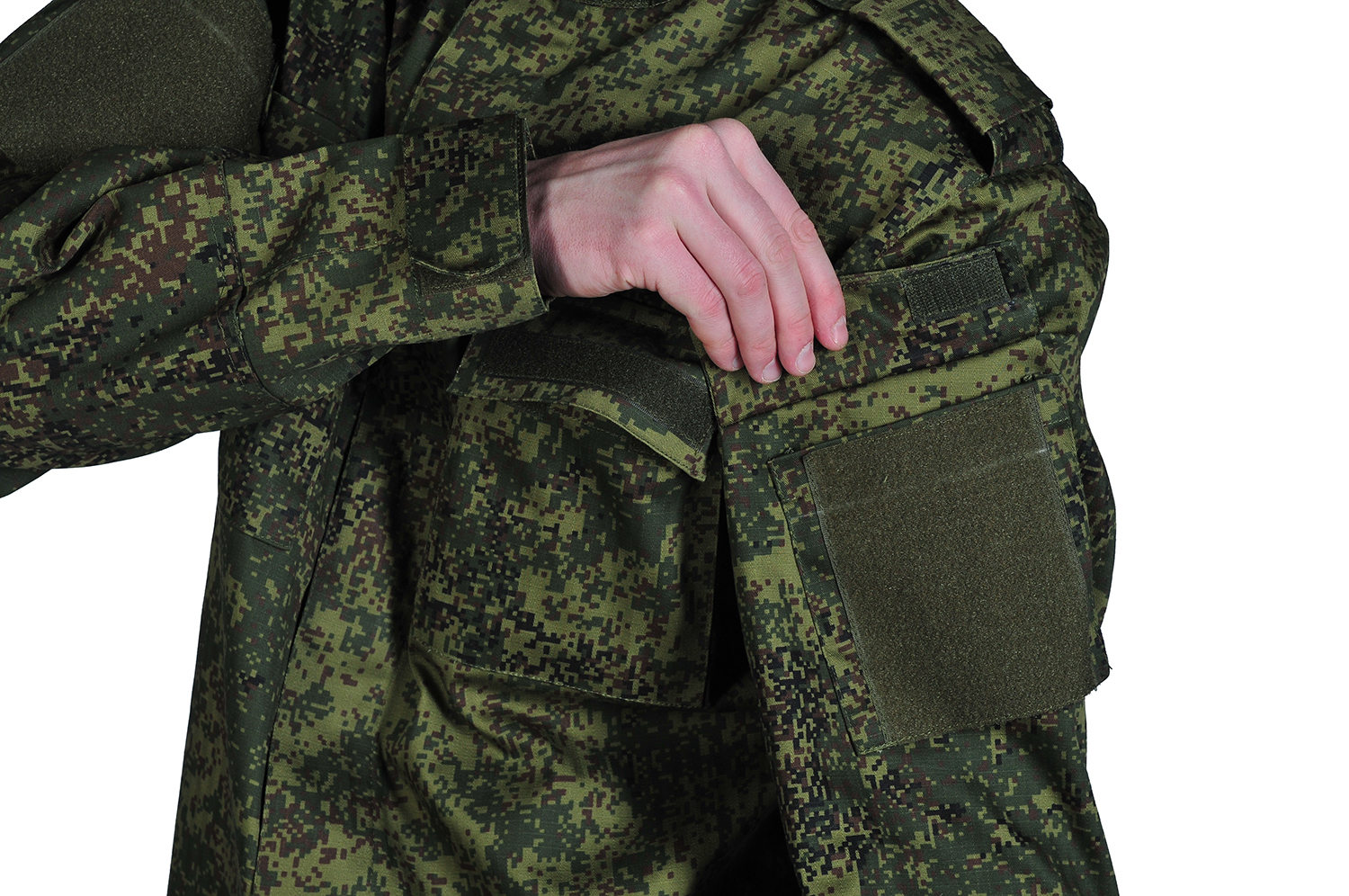 Воротник-стойка регулируется по объему, застегивается на липучку. Воротник оснащен липучками, которые защищает шею (например, бронежилетом). Рукава кителя усилены в локтевой области. Манжеты можно отрегулировать с помощью застежки-липучки. На кителе имеется 4 накладных карманам на липучке, а также имеется 1 карман с изнаночной стороны кителя, крепление для погонов и шевронов. Рукава усилены на локте, где расположены карманы для крепления защитных элементов.
