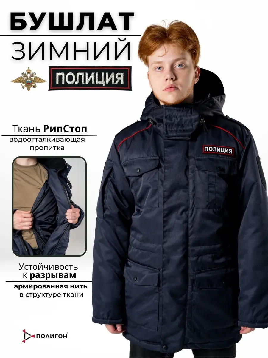 Бушлат уставной ПОЛИЦИЯ ткань рип-стоп, на мембране. Куртка не ограничивает движений, надежно защищает от холода, предназначена для ношения в зимнее время года сотрудниками полиции. Центральная застежка на молнии, закрытой ветрозащитным клапаном. В области плечевых швов расположены погоны на кнопках с съемными фальшпогонами для крепления знаков различия. Два нагрудных накладных кармана на кнопках. Два нижних накладных кармана на кнопках. Над нагрудным карманом и на спине вышивка ПОЛИЦИЯ. Подклад отстегивается, утеплитель бушлата надежно удерживает тепло, не впитывает влагу. Благодаря особенностям материала намокший бушлат очень быстро высыхает.