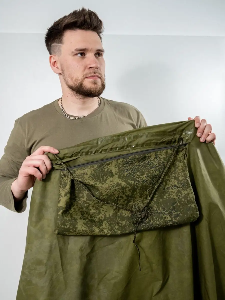 Плащ-палатка накидка специальная или армейский дождевик пончо Спецназа СпН (подразделения специального назначения). Изготовлена из капроновой ткани с полиуретановым покрытием камуфлированной расцветки. Выполнена из целого полотнища, в середине которого расположен капюшон. Швы проклеены и абсолютно герметичны. По периметру установлены люверсы и застёжки, позволяющие использовать её как тент или соединять несколько изделий вместе. На внутренней стороне спереди, располагается большой карман, в него путем обратной выворотки (удобная конструкция хранения сама-в-себе) и складывается плащ палатка после использования, закрываясь на вшитую молнию. В сложенном виде размер около 50х24см. Обычно используется как классическое пончо, или при застегивании рукавов превращается в плащ накидку (формируются рукава). Легко вмещает не только человека любого роста и веса (она всеразмерная, под все росты и габариты), но также заодно вместит и защитит от ветра и любого дождя большой рейдовый рюкзак на спине, и оружие в руках. Капюшон утягивается веревочной затяжкой с пластиковым фиксатором и регулируется как под размеры головы, так и под любые головные уборы, шлемы. При этом легко обеспечивается не ограниченная подвижность и высокая удобность применения. Военный дождевик отлично подходит для армейских войск и горных бригад специального назначения СпН спецназа, но также для туристов, страйкболистов, любителей охоты и рыбалки. Очень нравится эта накидка также грибникам и автомобилистам на случай поломки во время дождя. Плащ уникальный и многофункциональный элемент армейской экипировки, его можно использовать как: тент, козырьки, укрытия шалашей и открытых окопов, подстилка, прикрываются входы в землянки и шалаши, палатка, плащ-дождевик. Военная плащ палатка может послужить реквизитом на фото сессиях, исторических реконструкциях, для съемок исторического кино или боевиках и сериалов, а так же в театральных постановках.
