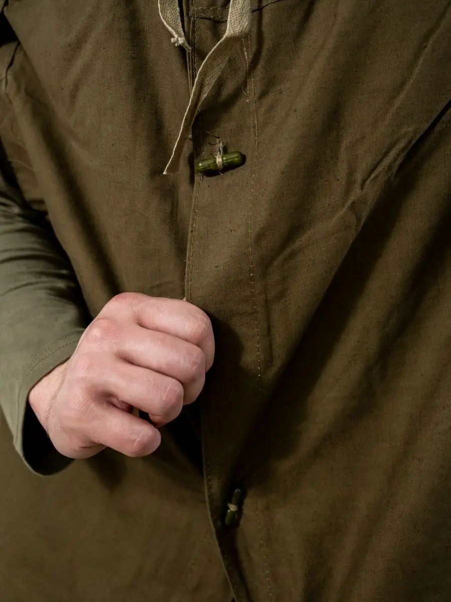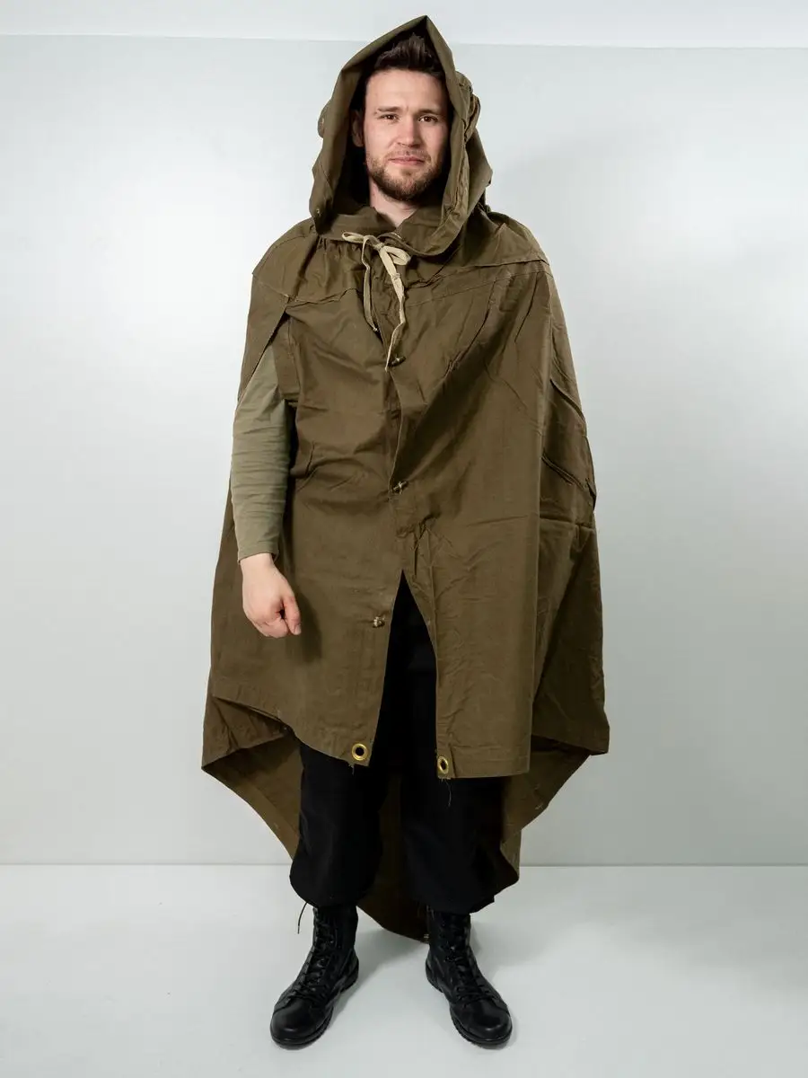 Плащ-палатка солдатская оливковая. Армейская плащ-палатка СССР. Материал брезент (палаточное полотно - очень прочное). Ткань полотно оливкового цвета (хаки). Размер: 180х180см. Свойства: высокая гидрофобность (непромокаемость); высокая огнестойкость; не продуваемость; легкость в переноске. Имеет форму квадрата и собирается в виде плаща с капюшоном и прорезью для правой руки. Нижний угол при этом закрепляется внутри при помощи деревянной пукли, а верхний стягивается шнуром, образуя колпак. Плащ уникальный и многофункциональный элемент армейской экипировки, его можно использовать как: тент, козырьки, укрытия шалашей и открытых окопов, подстилка, прикрываются входы в землянки и шалаши, палатка, плащ-дождевик. Военная плащ палатка может послужить реквизитом на фото сессиях, исторических реконструкциях, для съемок исторического кино, а так же в театральных постановках.