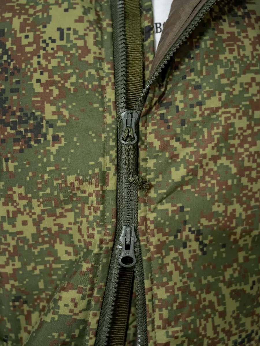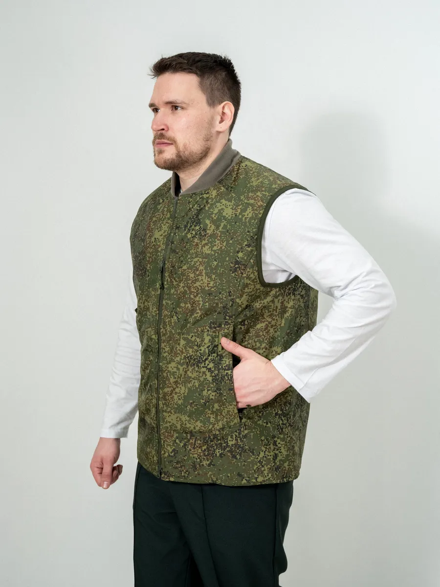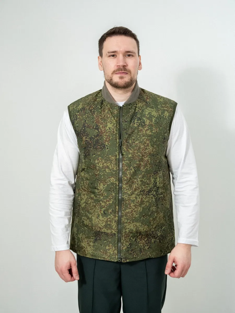 Жилет утепленный на подкладке входит во всесезонный комплект полевого обмундирования 7 уровень (ВКПО, ранее ВКБО). Жилет из комплекта вкпо используется как дополнительный изолирующий слой. В армейском жилете предусмотрен флисовый воротник, а также бортовая застежка на двух замковую молнию с внутренней ветрозащитной планкой. Спереди военного жилета вкпо расположены накладные карманы. По линии талии жилет регулируется фиксатором из эластичной шнуровки.